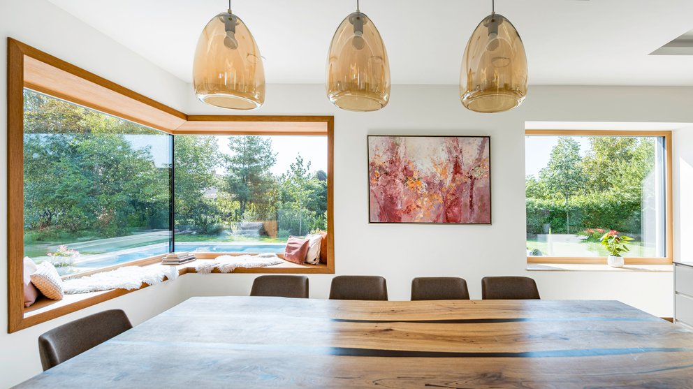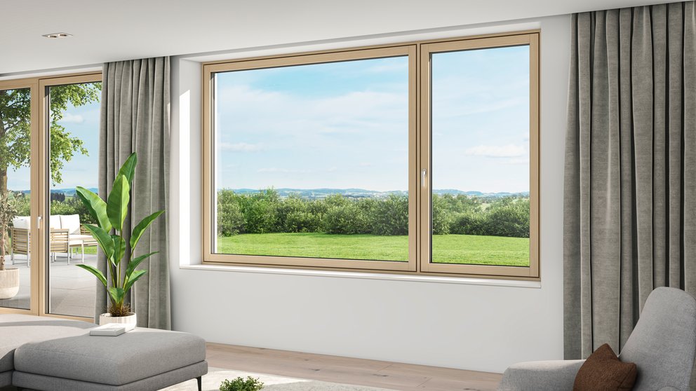 Durchdachte Farb- und Materialabstimmungen zwischen Möbeln, Böden und Fenstern verleihen jedem Raum seine besondere Atmosphäre. Das Holz-Aluminium-Fenster HF 410 unterstützt diese Gestaltung mit einer großen Auswahl an Holzarten und Farbtönen, sodass Sie Ihren Wohnraum bis ins Detail harmonisch abstimmen können.