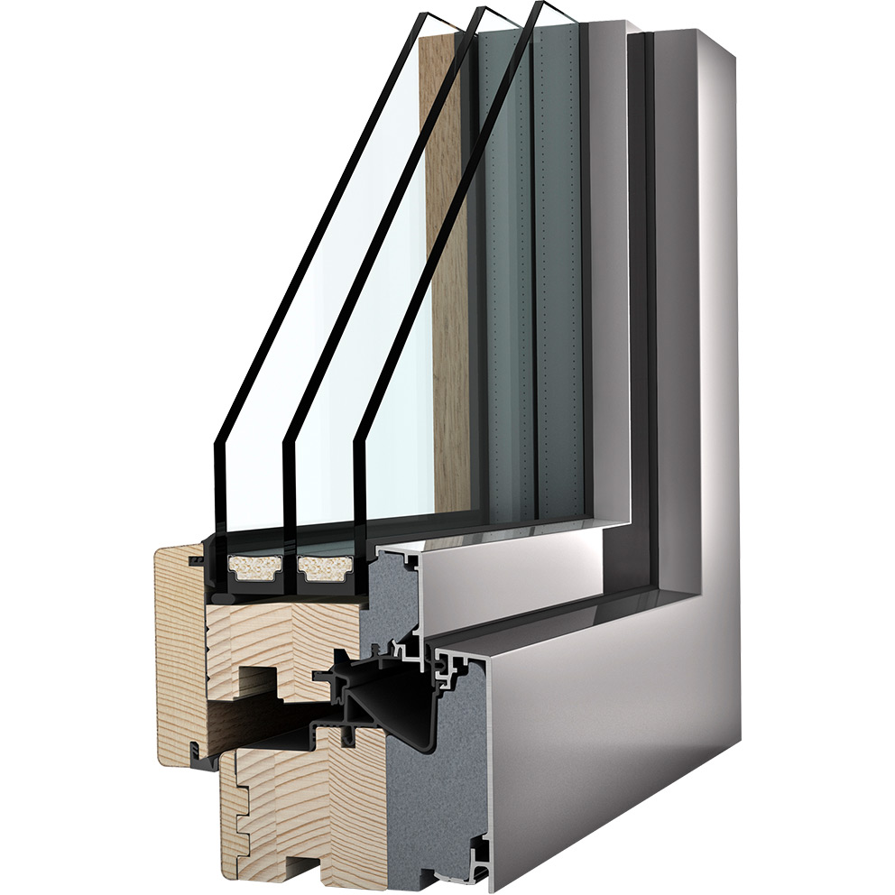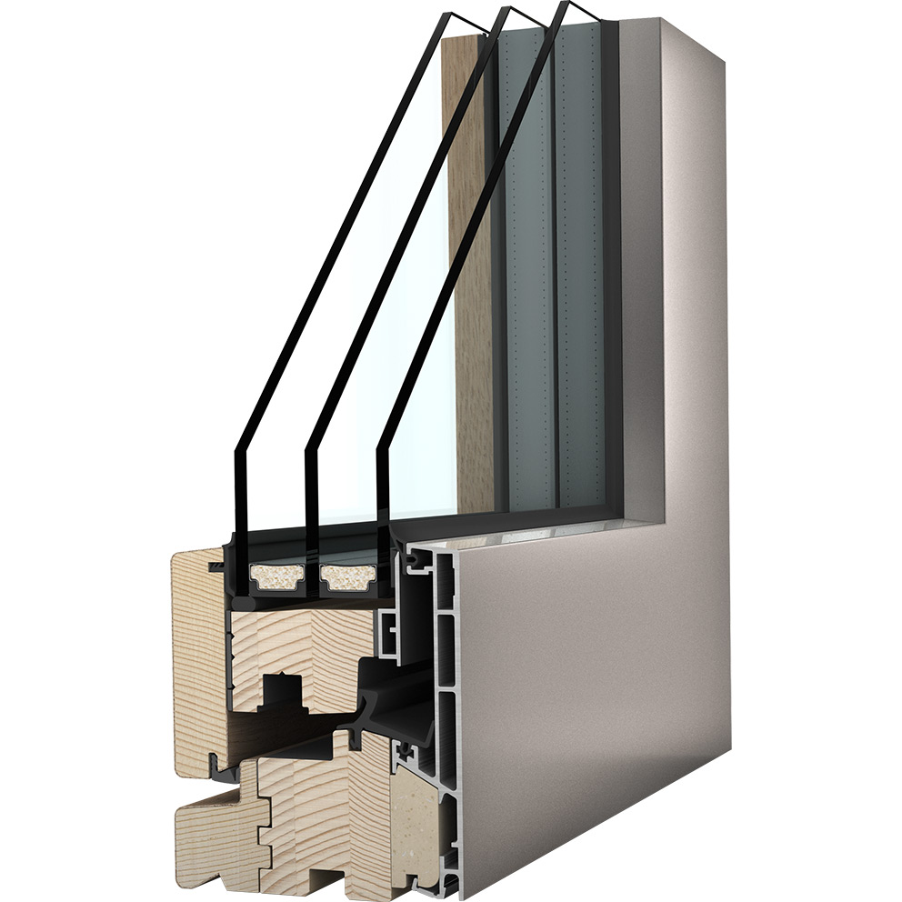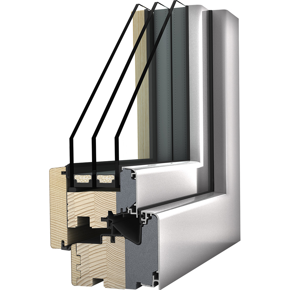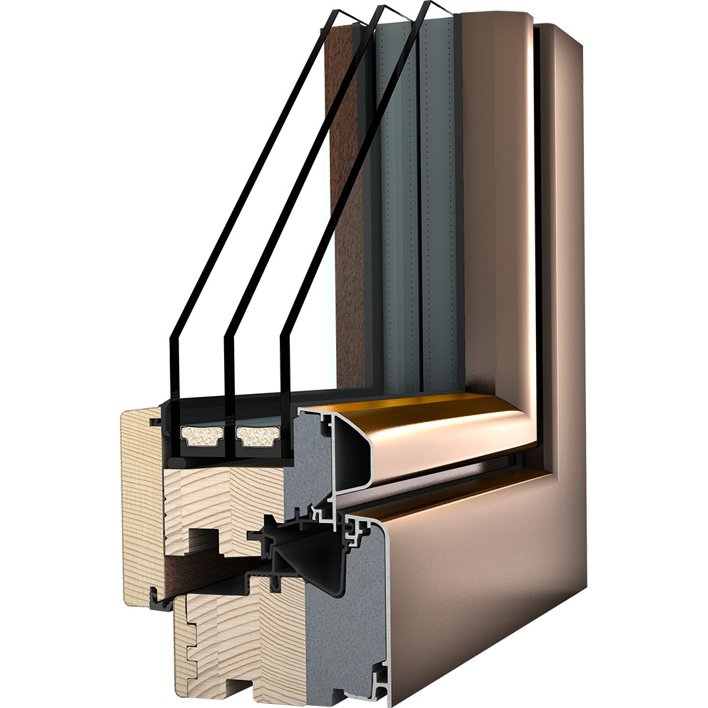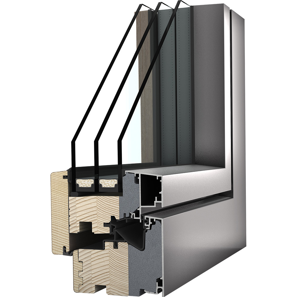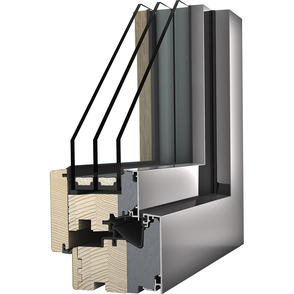 Innen sorgt die natürliche Holzoberfläche für ein angenehmes Wohngefühl, außen schützt das Aluminium dauerhaft vor Witterungseinflüssen. Zur Auswahl stehen klassische Holzarten wie Fichte und Lärche sowie Eiche, Esche und Nuss – jeweils in vielen Farbtönen, perfekt abgestimmt auf Böden, Türen und das gesamte Interior.