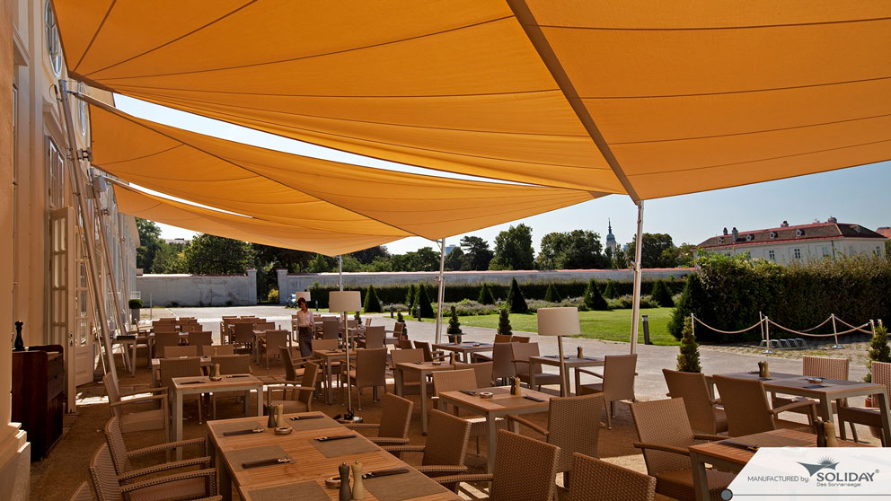 Die raffbaren Sonnensegel von SOLIDAY werden stets einzeln aufgehängt und können sowohl von einem Drahtseil als auch in Schienen geführt werden. Je nach Wunsch und abhängig davon, wieviel Schatten Sie benötigen, können die Segel ganz oder nur teilweise gerafft werden. SOLIDAY liefert Ihnen Segel bis zu einer Breite von max. 400 cm und einer Auszugslänge von 800 cm pro Bahn. Und sollten Sie eine schienengeführten Ausführung in Zusammenhang mit einer Motorisierung wählen, sind sogar Segel mit einer Baugröße von 60 m² pro Anlage (Breite 600 cm x Auszugslänge 1000 cm) möglich.